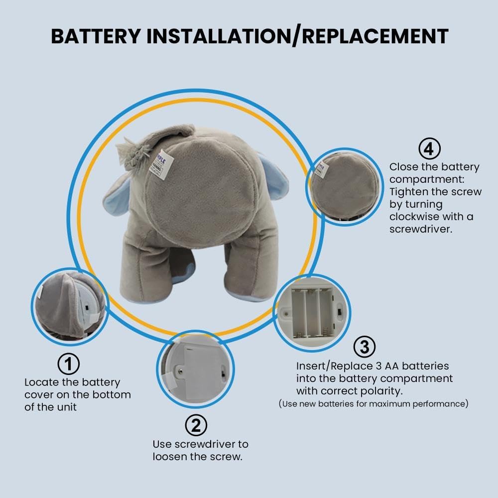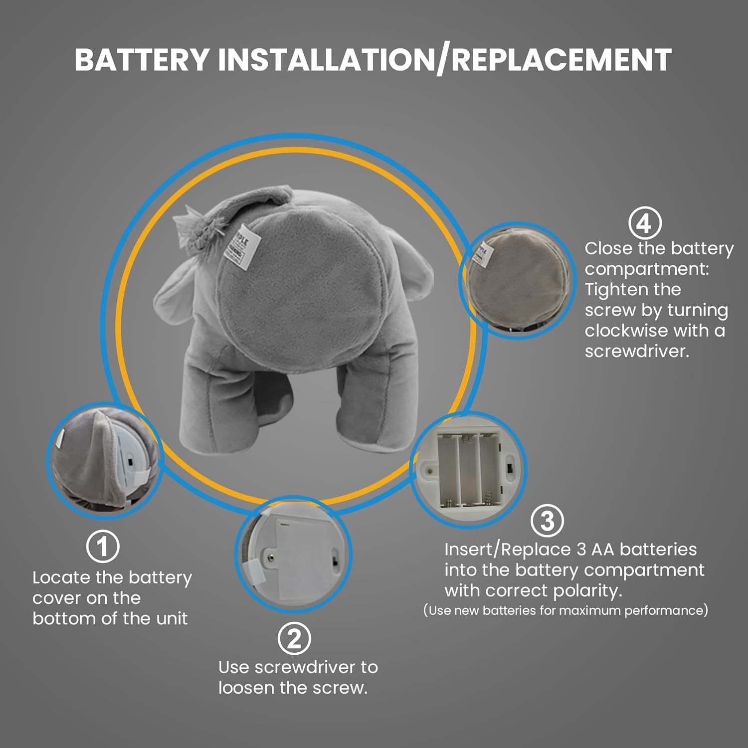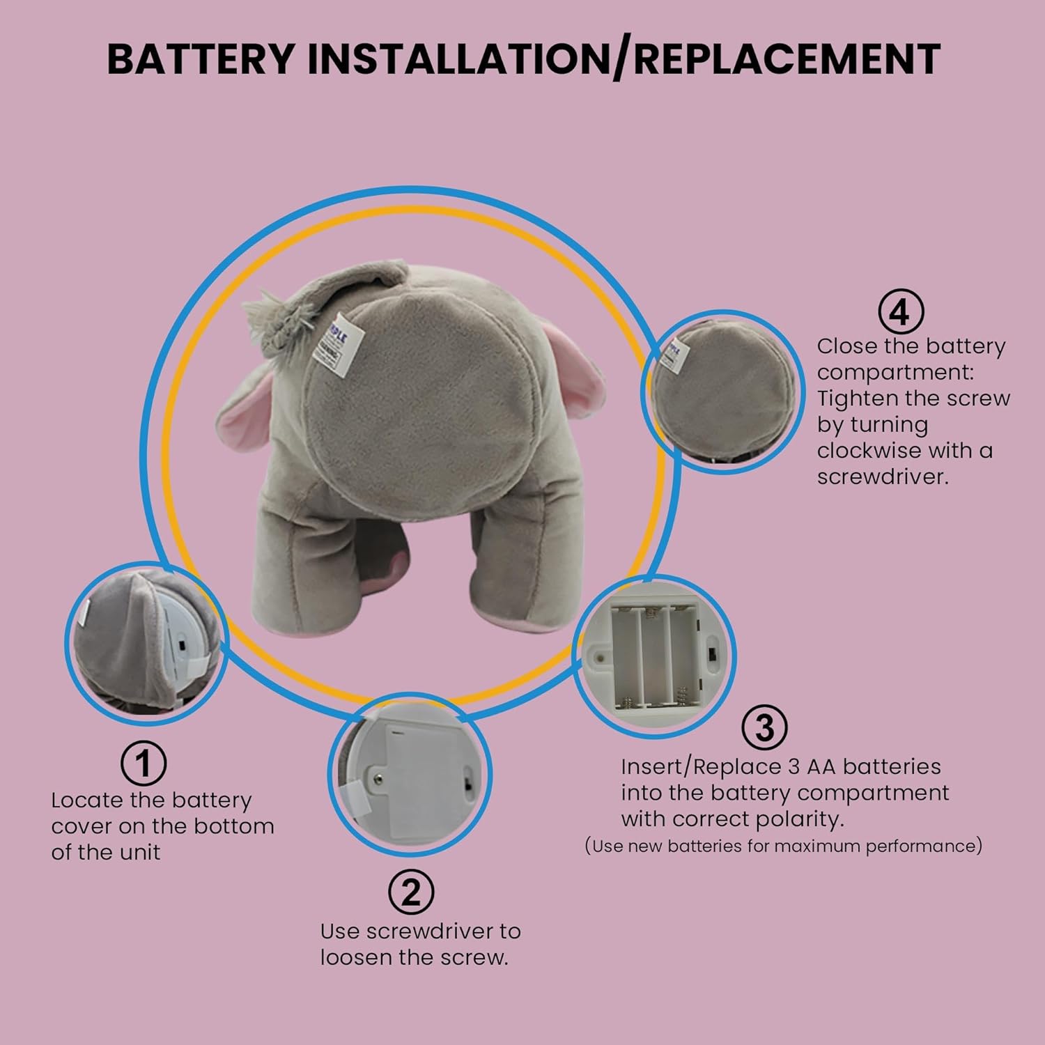 This animated elephant plush features two entertaining play modes with adjustable volume. Press the right foot to play cheerful children’s songs, and press the left foot to start a fun peek-a-boo game where the elephant’s soft ears cover its eyes in a playful motion.