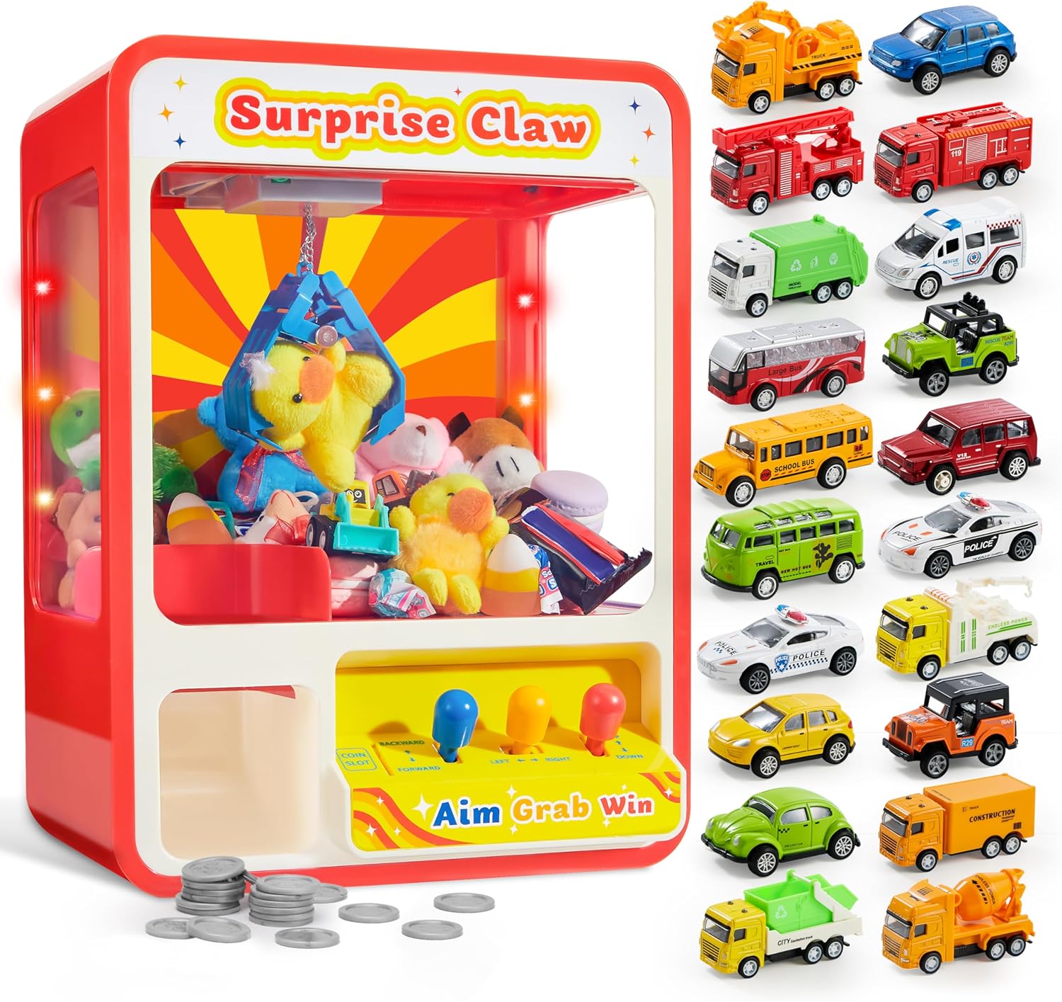 Claw machine containing 20 alloy pull-back toy cars.